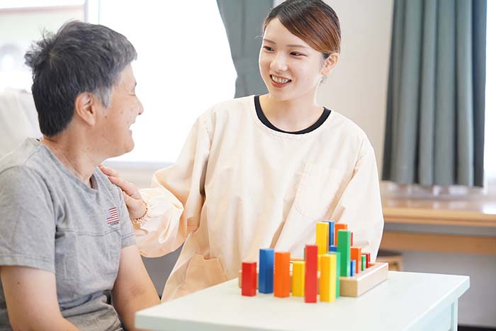 先輩⽅を⾒ていると、利⽤者様を⾒守るばかりでなく、活動の合間を⾒つけて⼿遊びをしたり、その⽅ができることをとことん⾃分でやってもらったりと、私より積極的なはたらきかけをしています。その仕事ぶりを⾒習い、より適切な⽀援ができるようになることが当⾯の⽬標です。